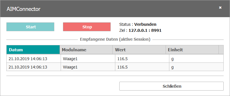 Im AIMConnector wird eine „neue“ Waage mit der Schaltfläche „Additional Connection“ erzeugt. Es entsteht eine neue Registerkarte.