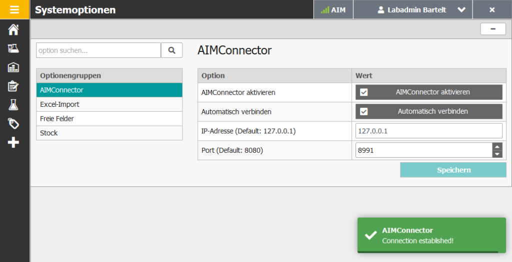 Nach dem Speichern der Systemoptionen versucht sich nun chemXPERTmit dem AIMConnector zu verbinden.